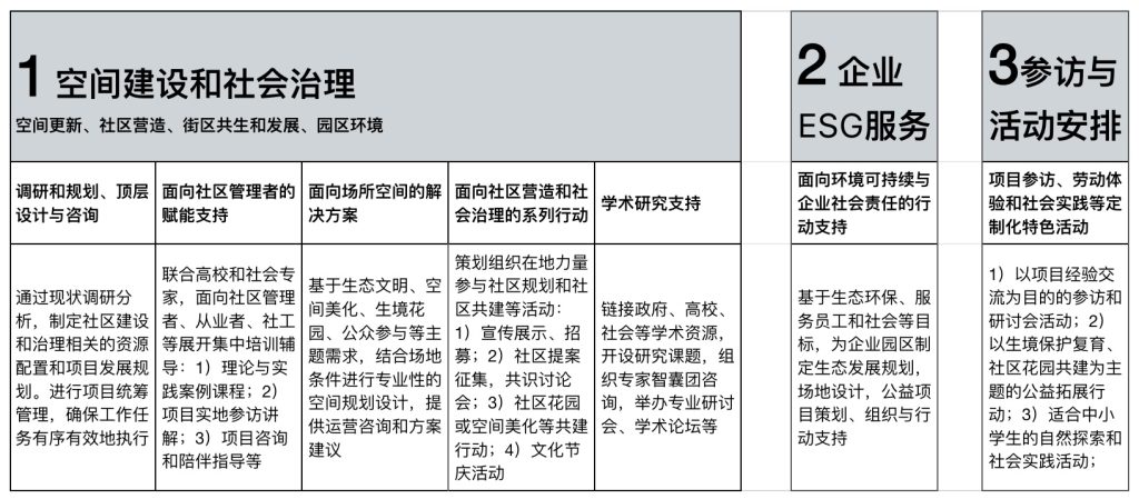 基于空间建设和社会治理领域,四叶草堂可以提供调研规划、方案设计、行动赋能和组织等全方位的服务支持: